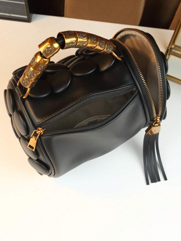 CM-BGS451592 Women Trendy Seoul Style Dotted Pattern Bolster Pillow Shaped Cylinder Bag - Black