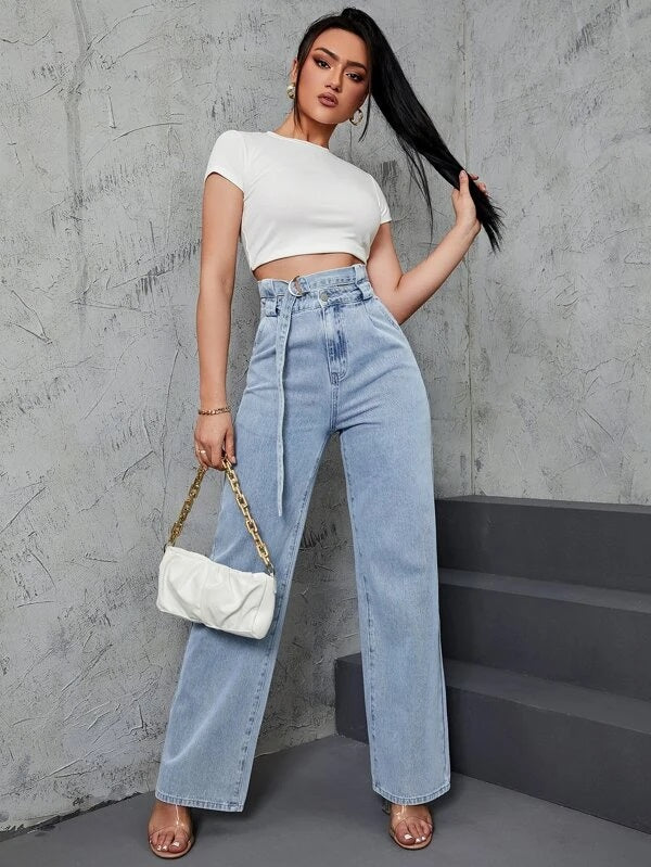 CM-BS021756 Women Casual Seoul Style Light Wash High Waist Belted Straight Leg Jeans