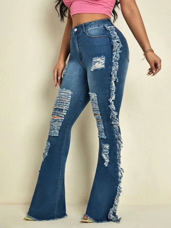CM-BS054730 Women Casual Seoul Style Ripped Frayed Raw Hem Flare Leg Jeans
