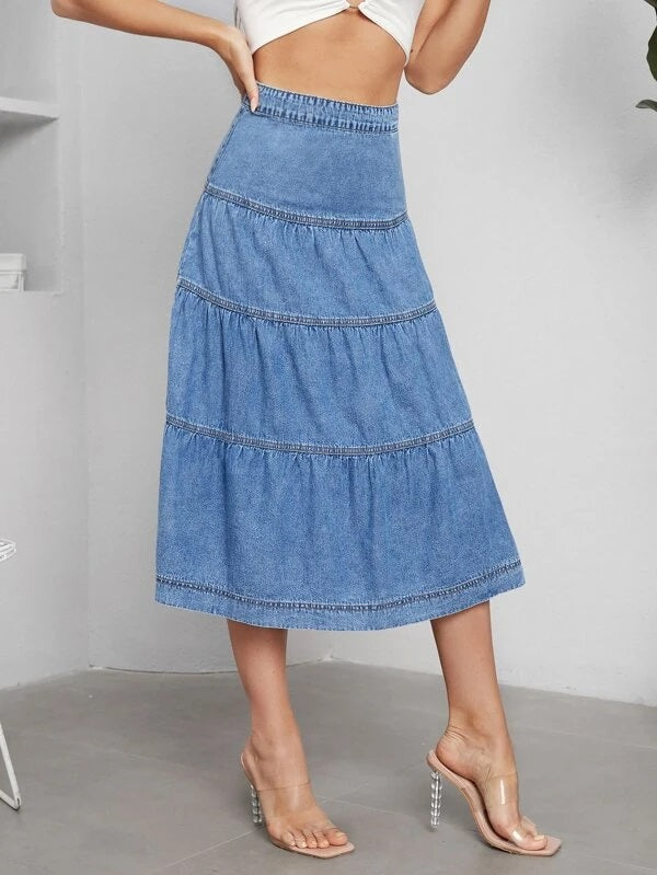 CM-BS138276 Women Casual Seoul Style High Waist Ruffle Hem Denim Skirt