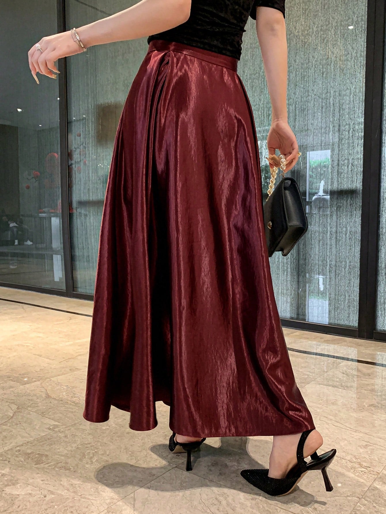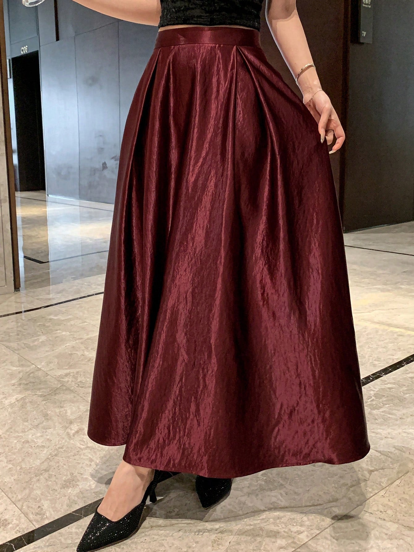 CM-BS235763 Women Elegant Seoul Style Satin Pleated Maxi Skirt - Burgundy