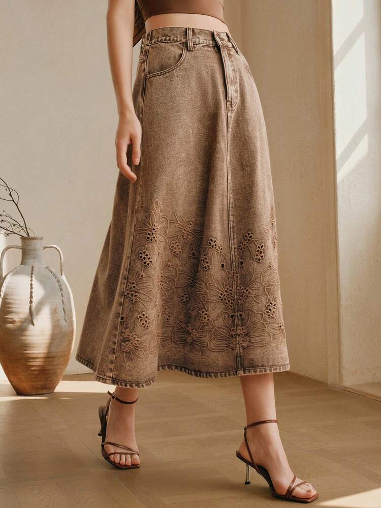 CM-BS284747 Women Elegant Seoul Style High Waist Hollow Embroidered A-Line Denim Skirt - Khaki