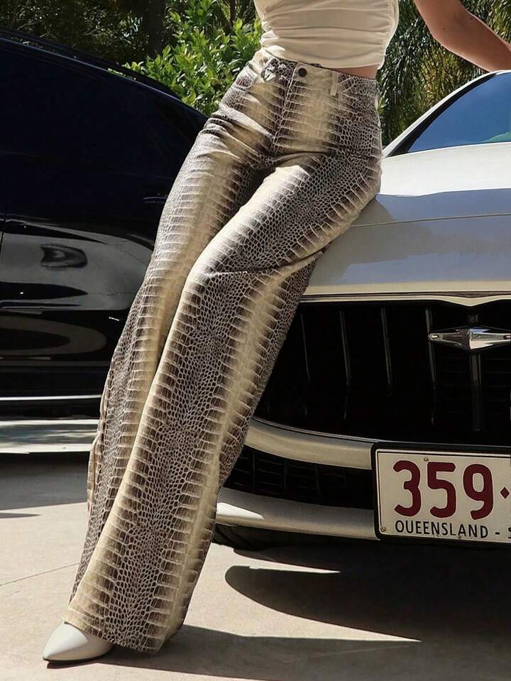 CM-BS361122 Women Casual Seoul Style Mid Waist Snake Print Floral Straight Leg Loose Jeans