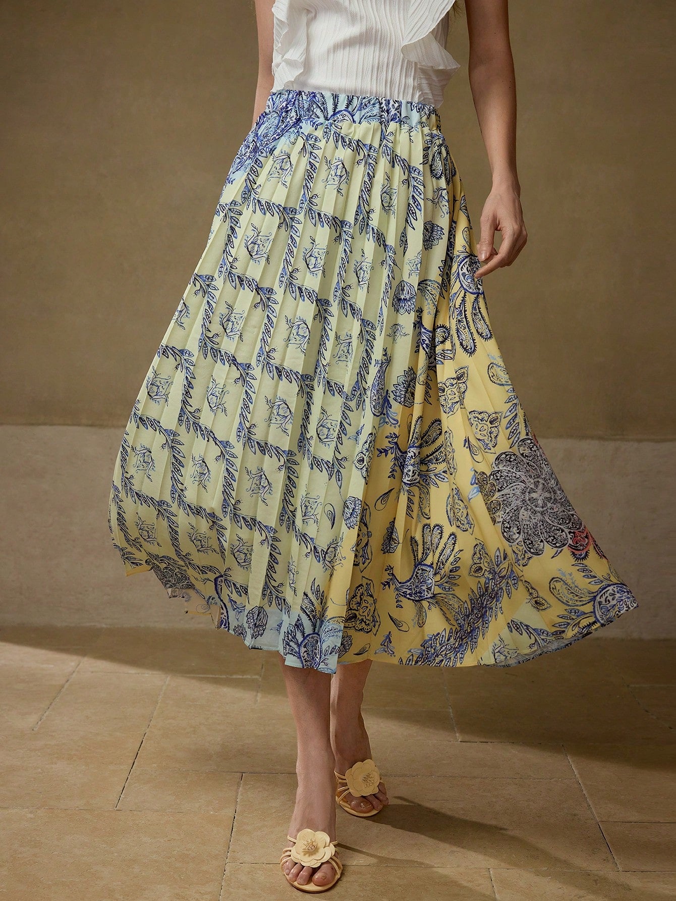 CM-BS583669 Women Trendy Bohemian Style Mid Waist All Over Print Pleated Mid-Length Skirt