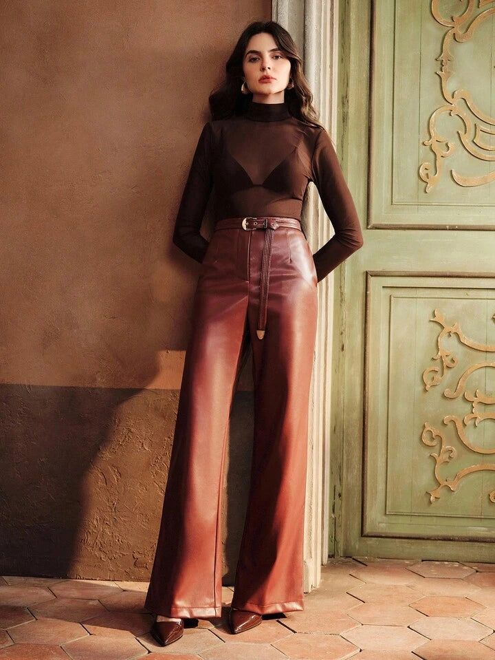 CM-BS720037 Women Elegant Seoul Style High Waist PU Leather Belted Straight Leg Pants - Burgundy