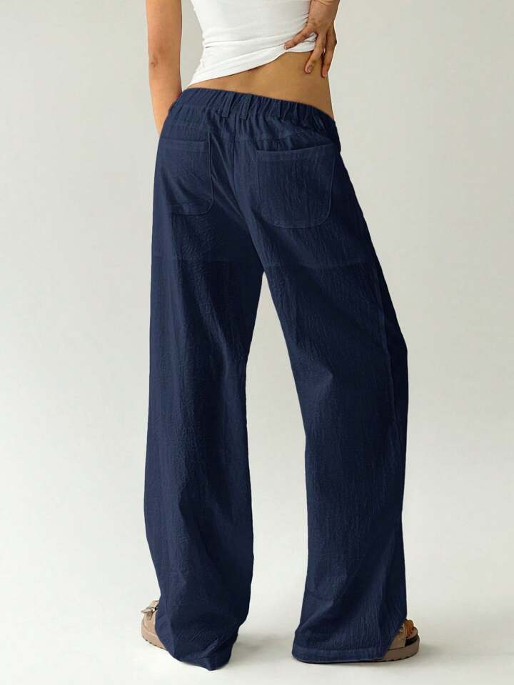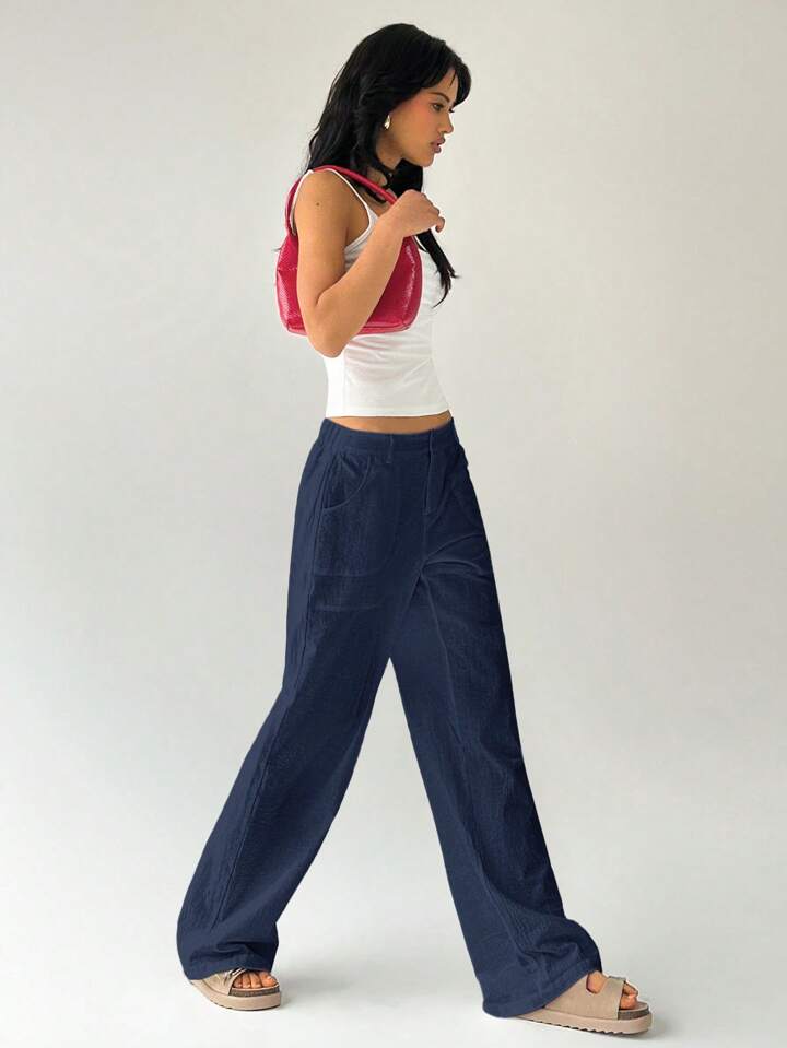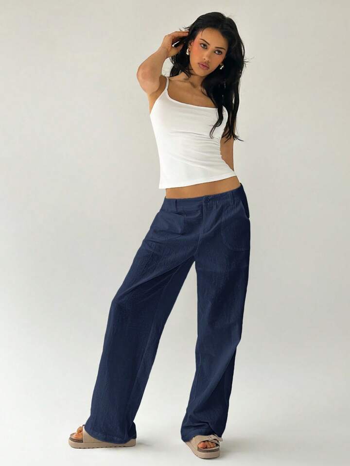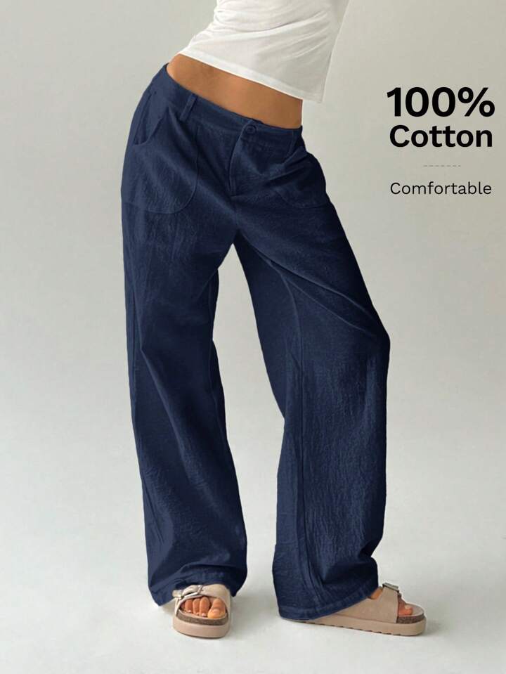 CM-BS787739 Women Casual Seoul Style Solid Color Low Waist Loose Straight Leg Pants - Navy Blue