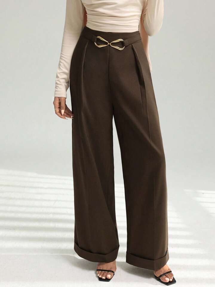 CM-BS934660 Women Casual Seoul Style Metal Buckle Waistband Rolled Hem Wide Leg Pants - Coffee Brown