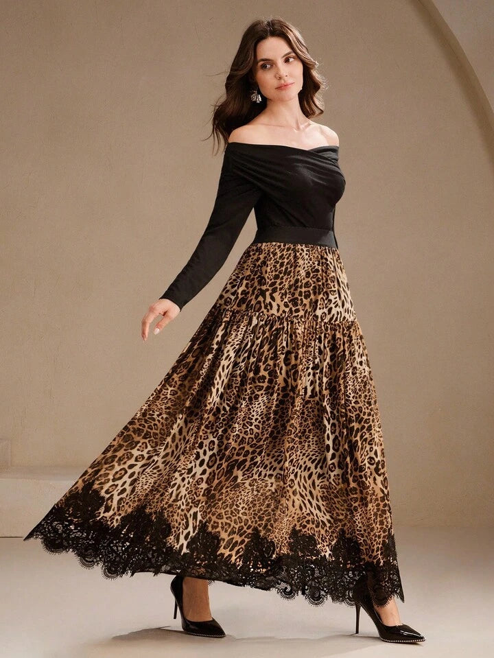 CM-BS944884 Women Elegant Seoul Style Leopard Print Patchwork Lace Elastic Waist A-Line Maxi Skirt