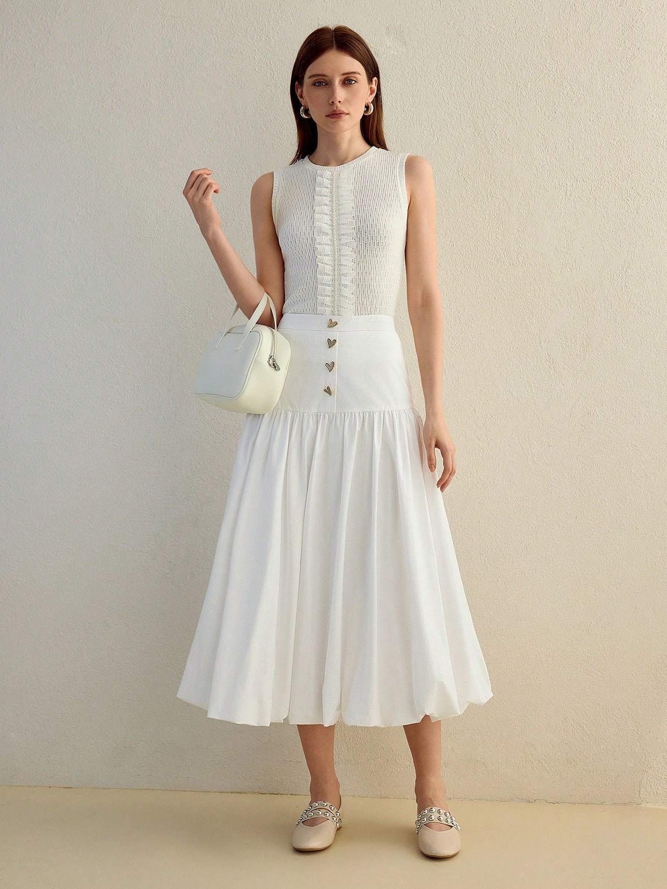 CM-BS954544 Women Elegant Seoul Style Button Front Fold Pleated Mid-Length Skirt - White