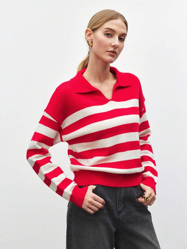CM-CS176649 Women Casual Seoul Style Stripe Collar Neckline Drop Shoulder Long Sleeve Sweater - Red