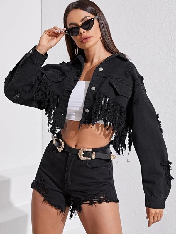 CM-CS209442 Women Preppry Seoul Style Distressed Frayed Cropped Denim Jacket - Black