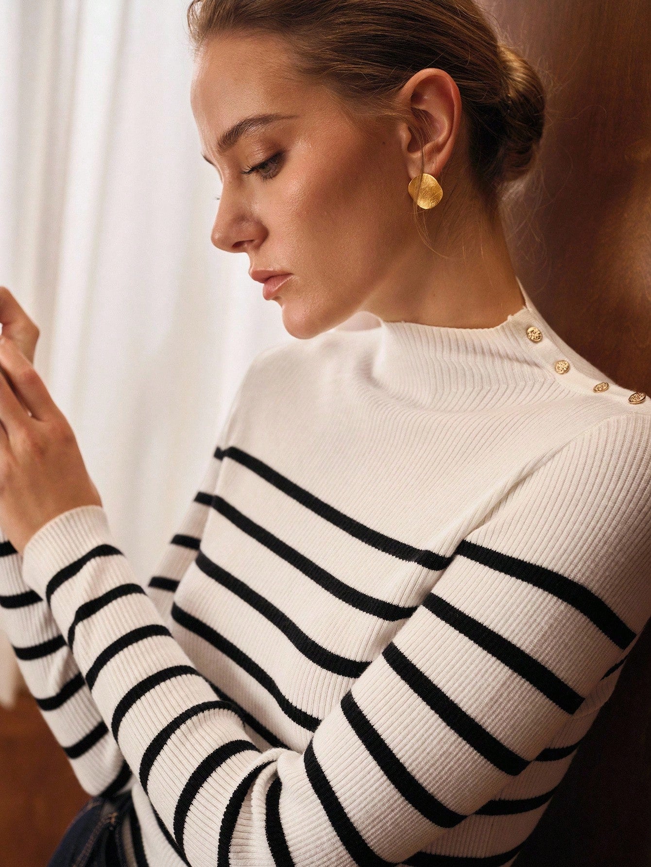 CM-CS286731 Women Elegant Seoul Style Striped Stand Collar Long Sleeve Knit Pullover Sweater