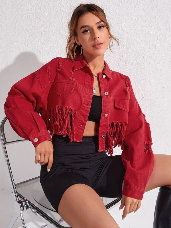 CM-CS314911 Women Preppy Seoul Style Distressed Frayed Cropped Denim Jacket - Burgundy