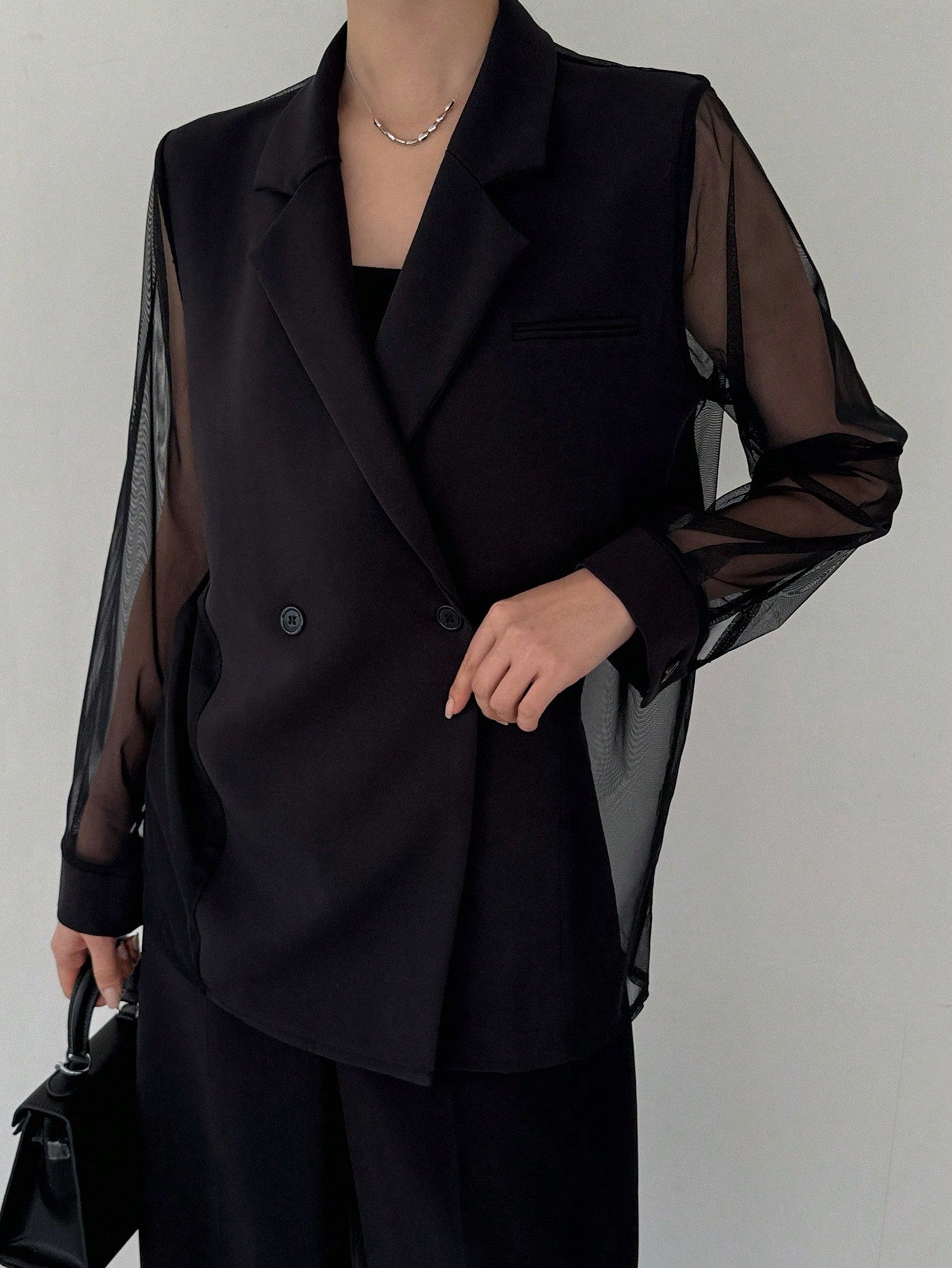 CM-CS348444 Women Casual Seoul Style Mesh Patchwork Long Sleeve Transparent Suit Jacket - Black