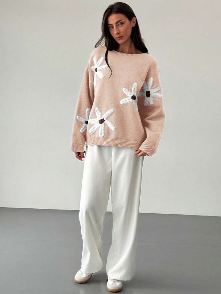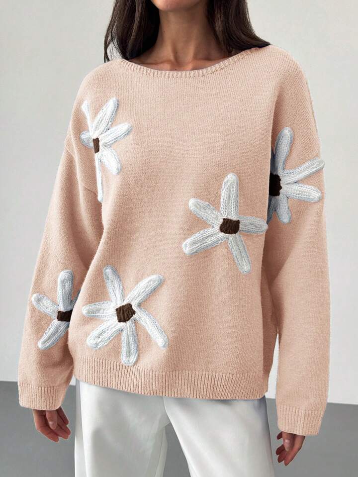 CM-CS463499 Women Casual Seoul Style 3D Floral Decoration Loose Fit Long Sleeve Sweater - Apricot