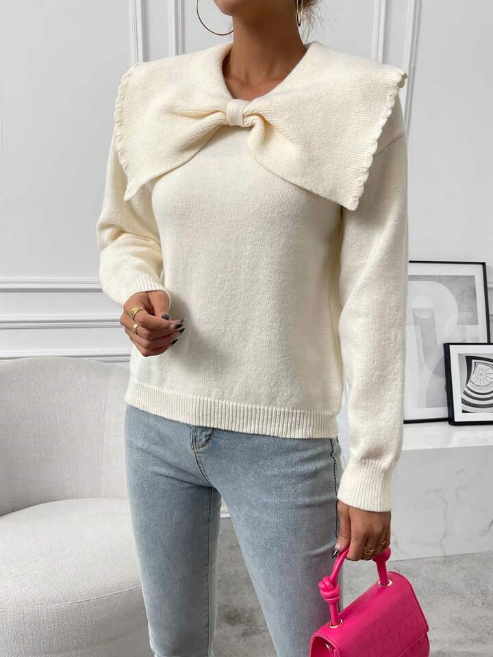 CM-CS575335 Women Casual Seoul Style Statement Collar Bow Front Long Sleeve Sweater - Apricot