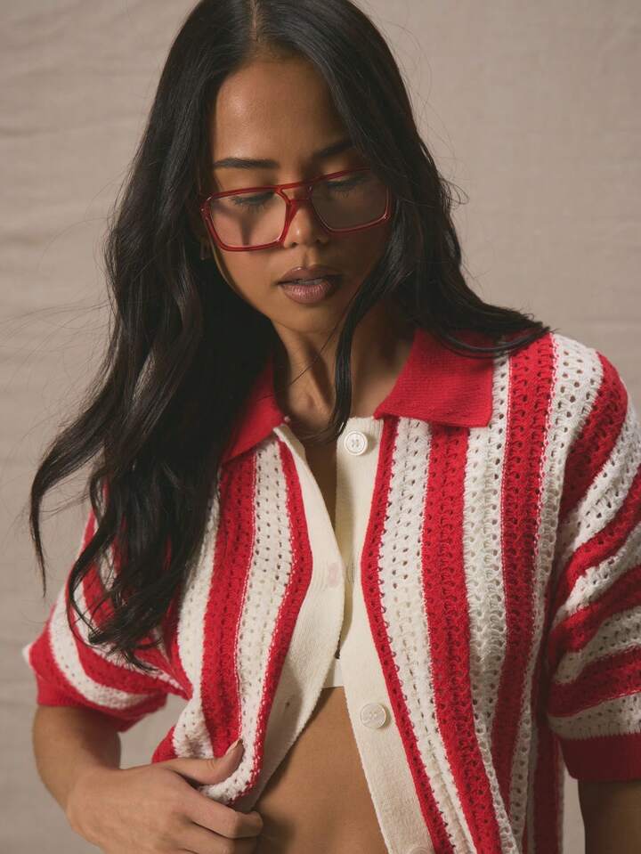 CM-CS831167 Women Casual Seoul Style Striped Drop Shoulder Button Through Short Sleeve Cardigan