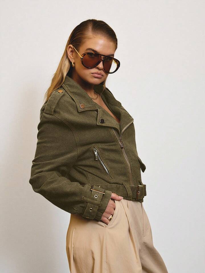 CM-CS927391 Women Elegant Seoul Style Cropped Denim Biker Jacket With Gold Trim Details - Army Green