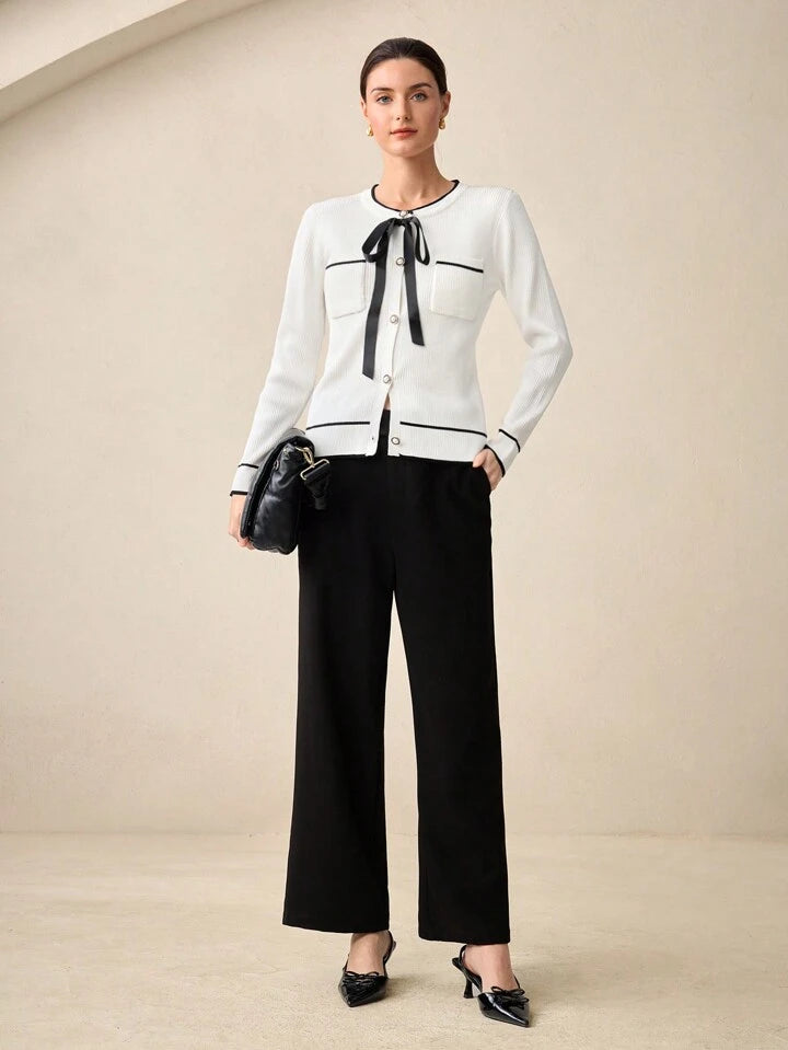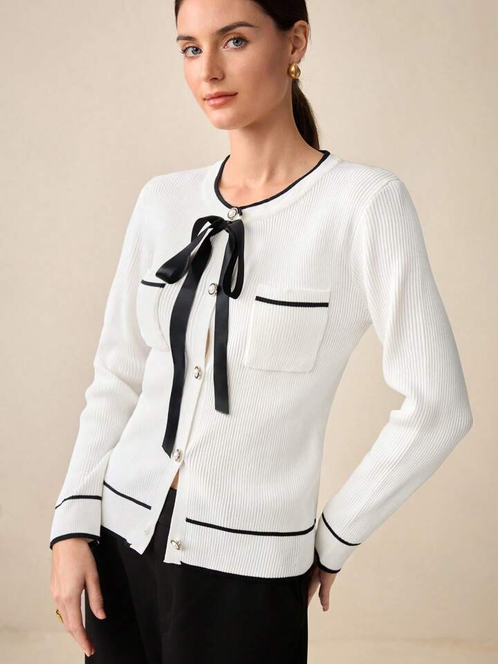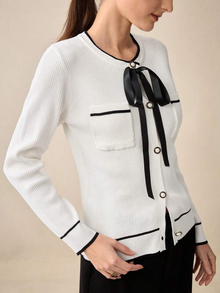 CM-CS945558 Women Casual Seoul Style White Bow Accent Contrast Collar Long Sleeve Cardigan