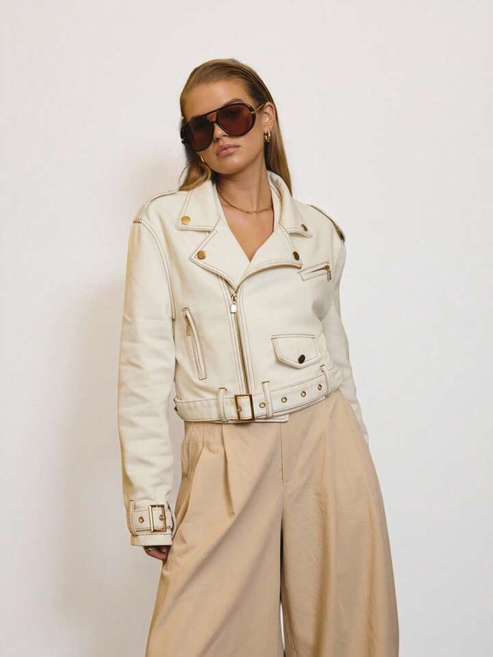 CM-CS964743 Women Elegant Seoul Style Cropped Denim Biker Jacket With Gold Trim Details - White