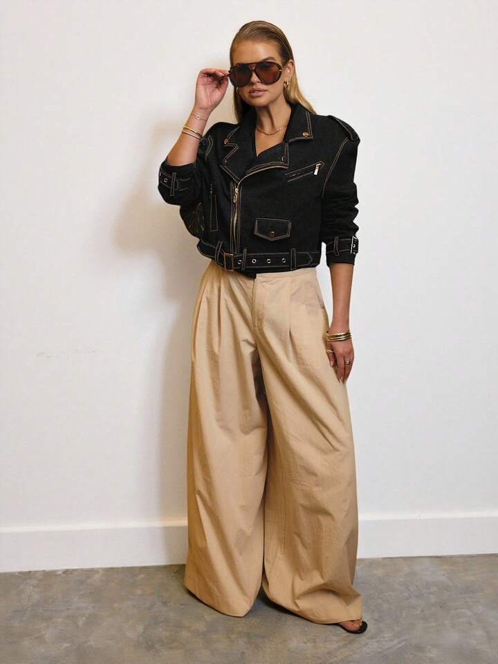 CM-CS983640 Women Elegant Seoul Style Cropped Denim Biker Jacket With Gold Trim Details - Black