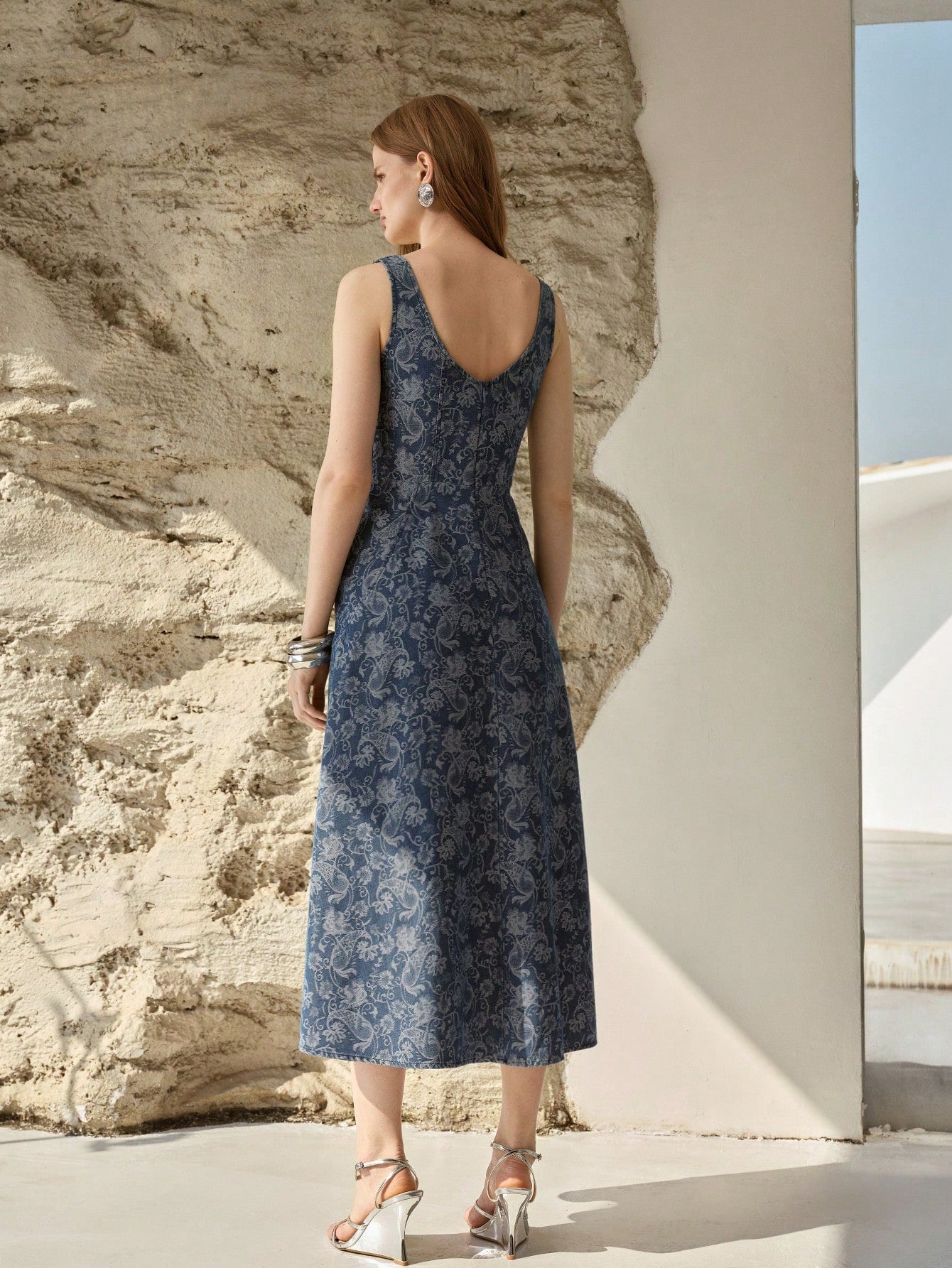 CM-DS007774 Women Elegant Seoul Style Scoop Neck Sleeveless Jacquard Cinched Waist Denim Dress - Blue