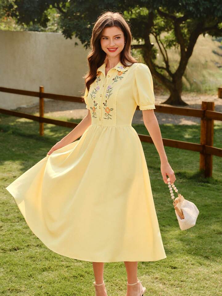 CM-DS243089 Women Elegnat Seoul Style Floral Patchwork Embroidered Fitted Splice A-Line Midi Dress - Pale Yellow