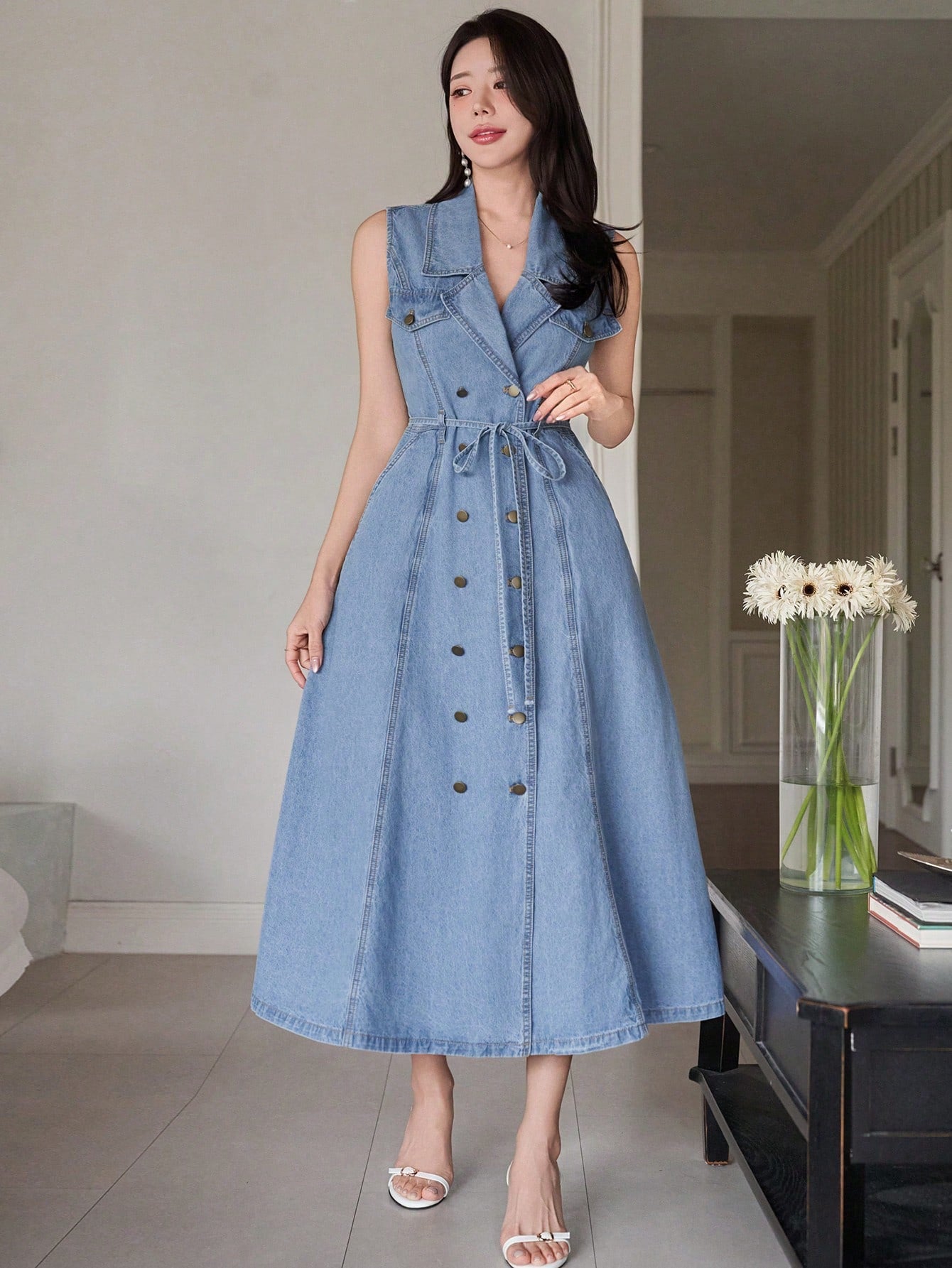 CM-DS252161 Women Casual Seoul Style Lapel Collar Sleeveless High Waist Denim Dress With Belt - Blue