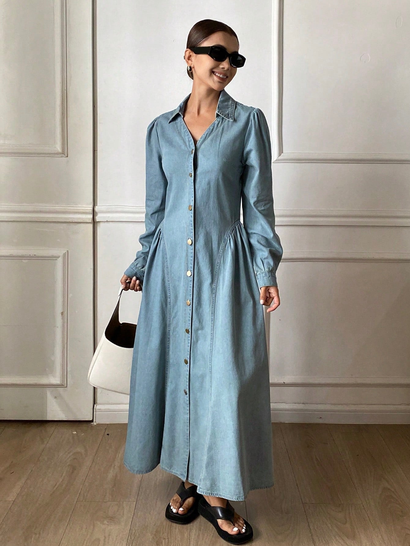 CM-DS524248 Women Casual Seoul Style Light Wash Lapel Neckline Long Sleeve Waist Cinching Denim Dress