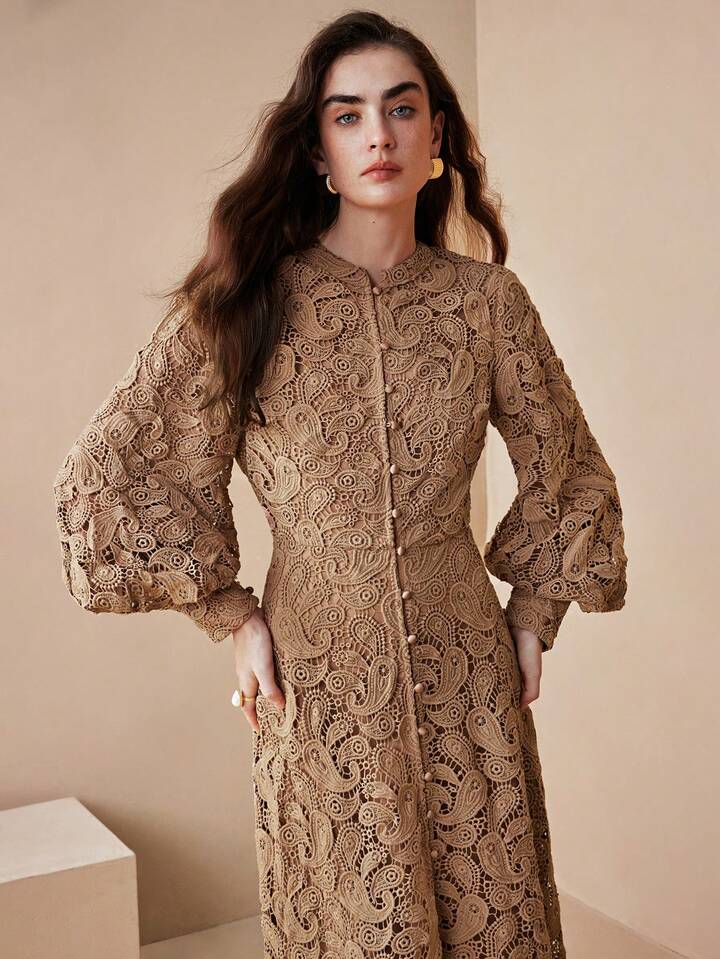 CM-DS541343 Women Elegant Seoul Style Embroidered Floral Design Extra Long Sleeve A-Line Maxi Dress - Apricot