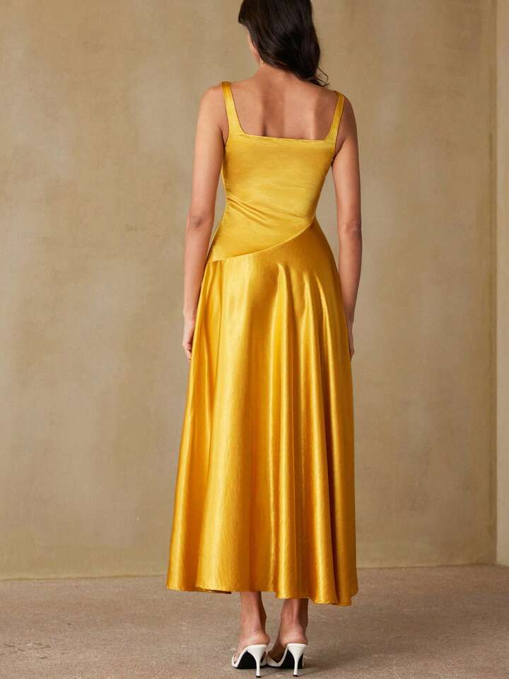 CM-DS567698 Women Elegant Seoul Style Square Neck Sleeveless Patchwork Irregular Asymmetric Satin Midi Dress