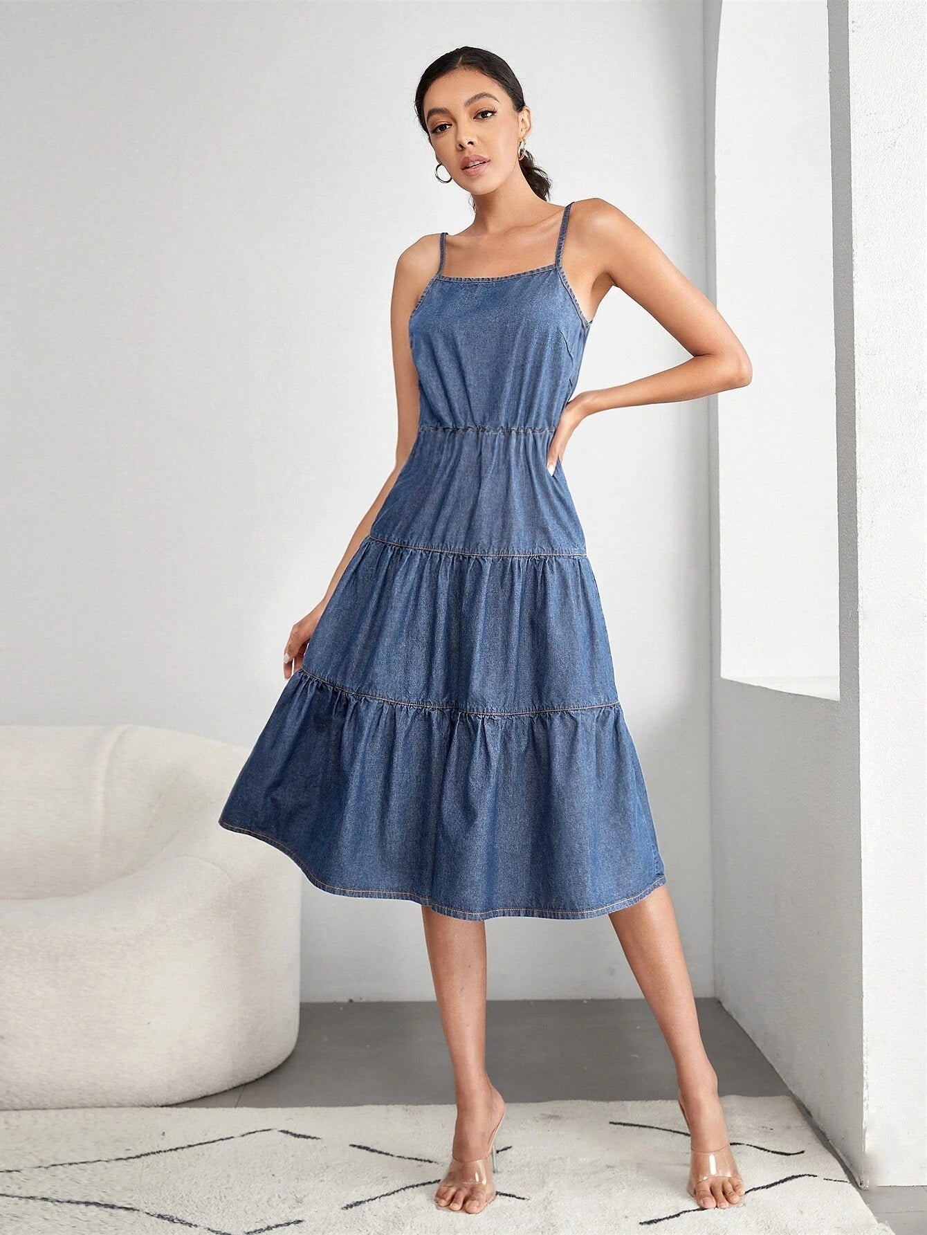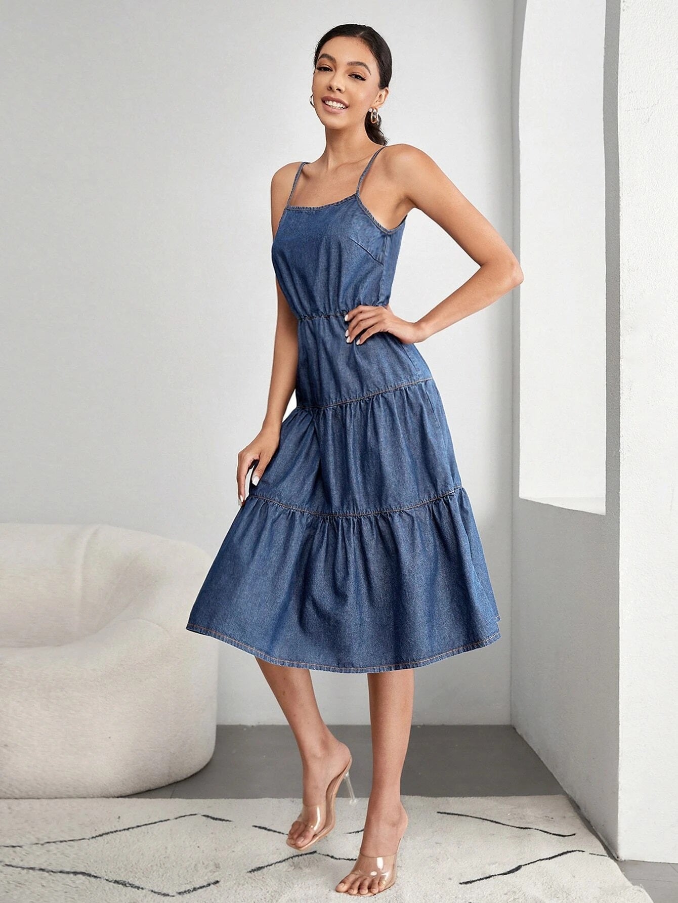 CM-DS738000 Women Preppy Seoul Style Medium Wash Ruffle Hem Cami Denim Dress