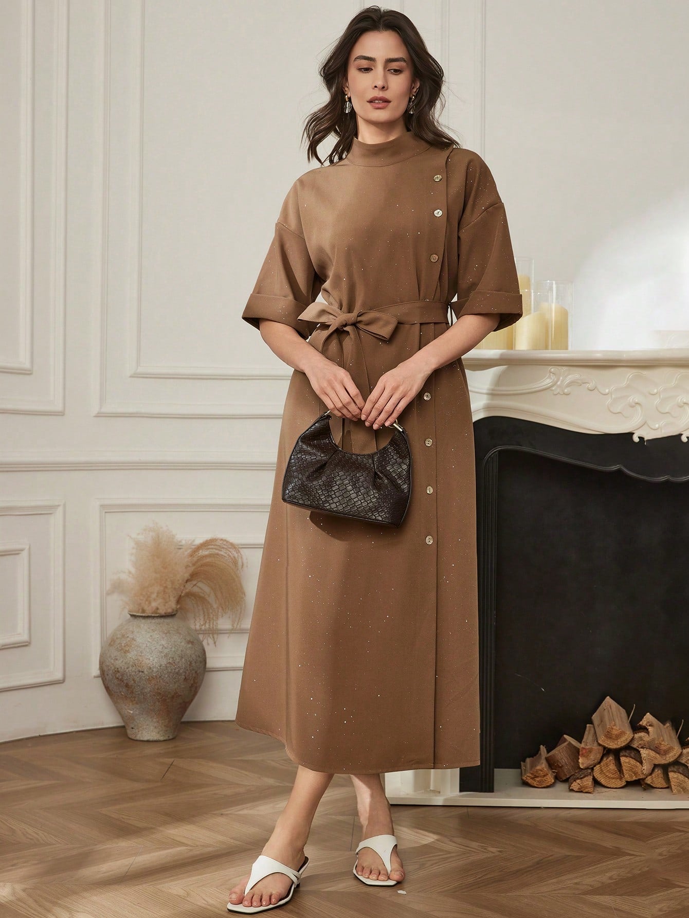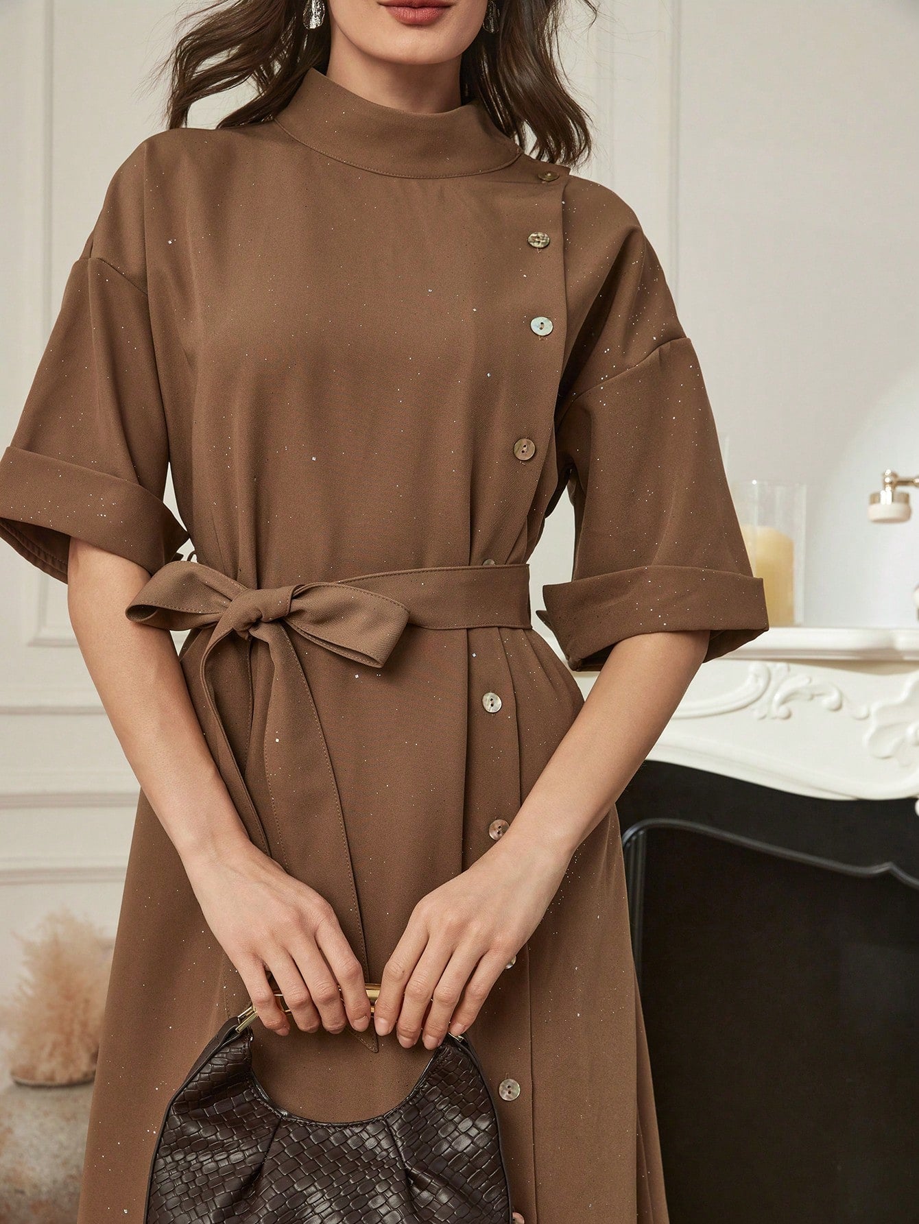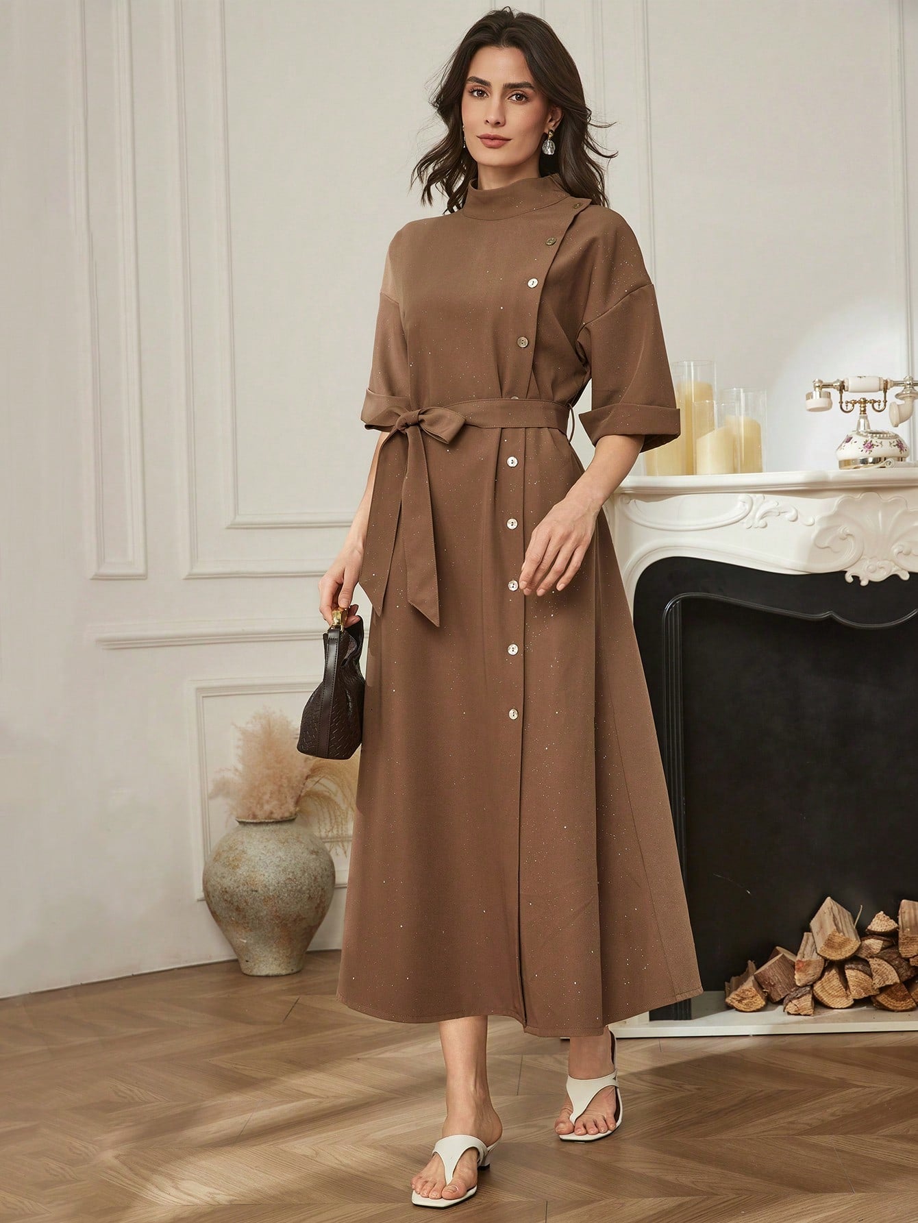 CM-DS791843 Women Elegant Seoul Style Solid Color Stand Collar Drop Shoulder Single-Breasted Long Dress - Brown