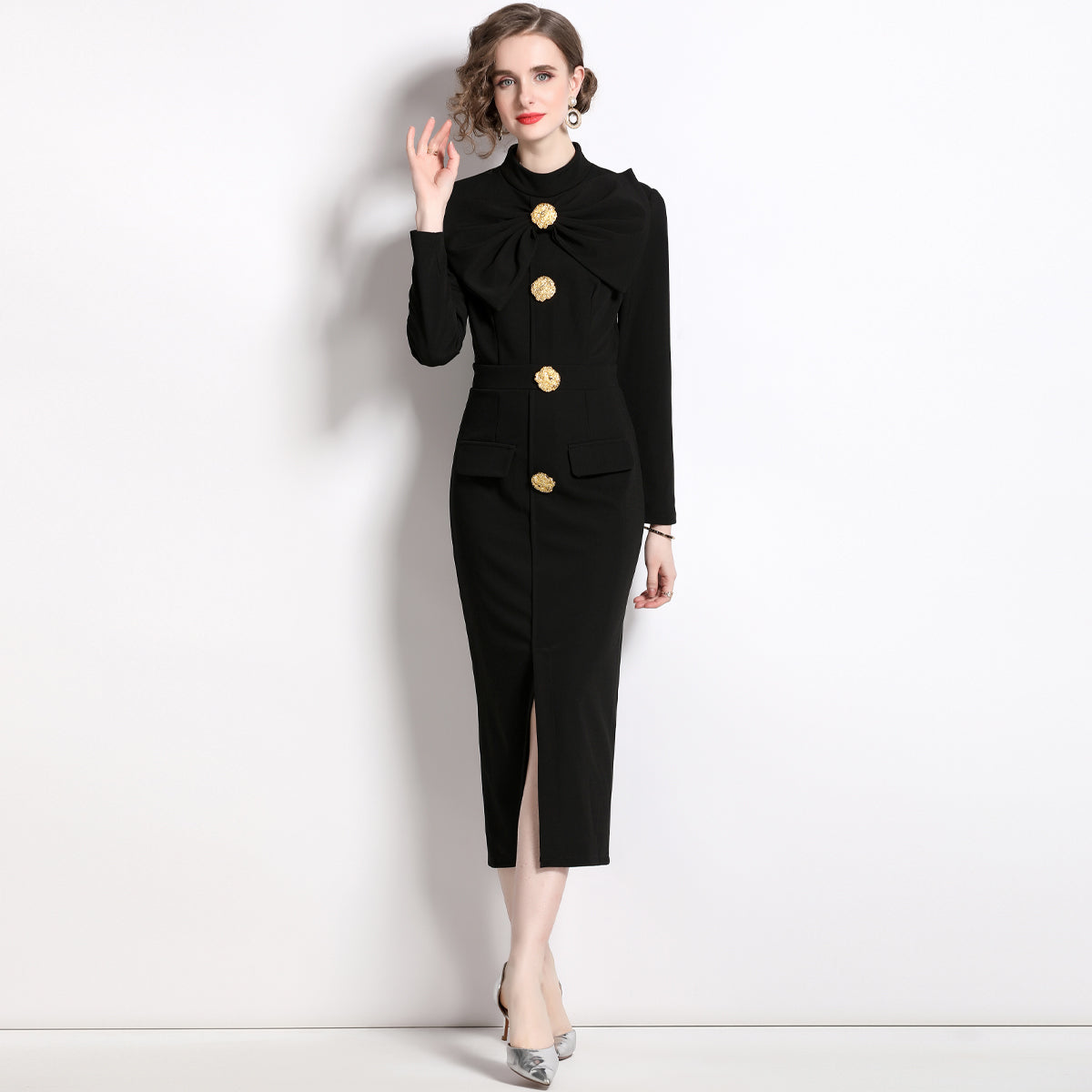 CM-DY060152 Women Elegant European Style Split Bow Round Neck Pinched Waist Long Sleeve Midi Dress - Black