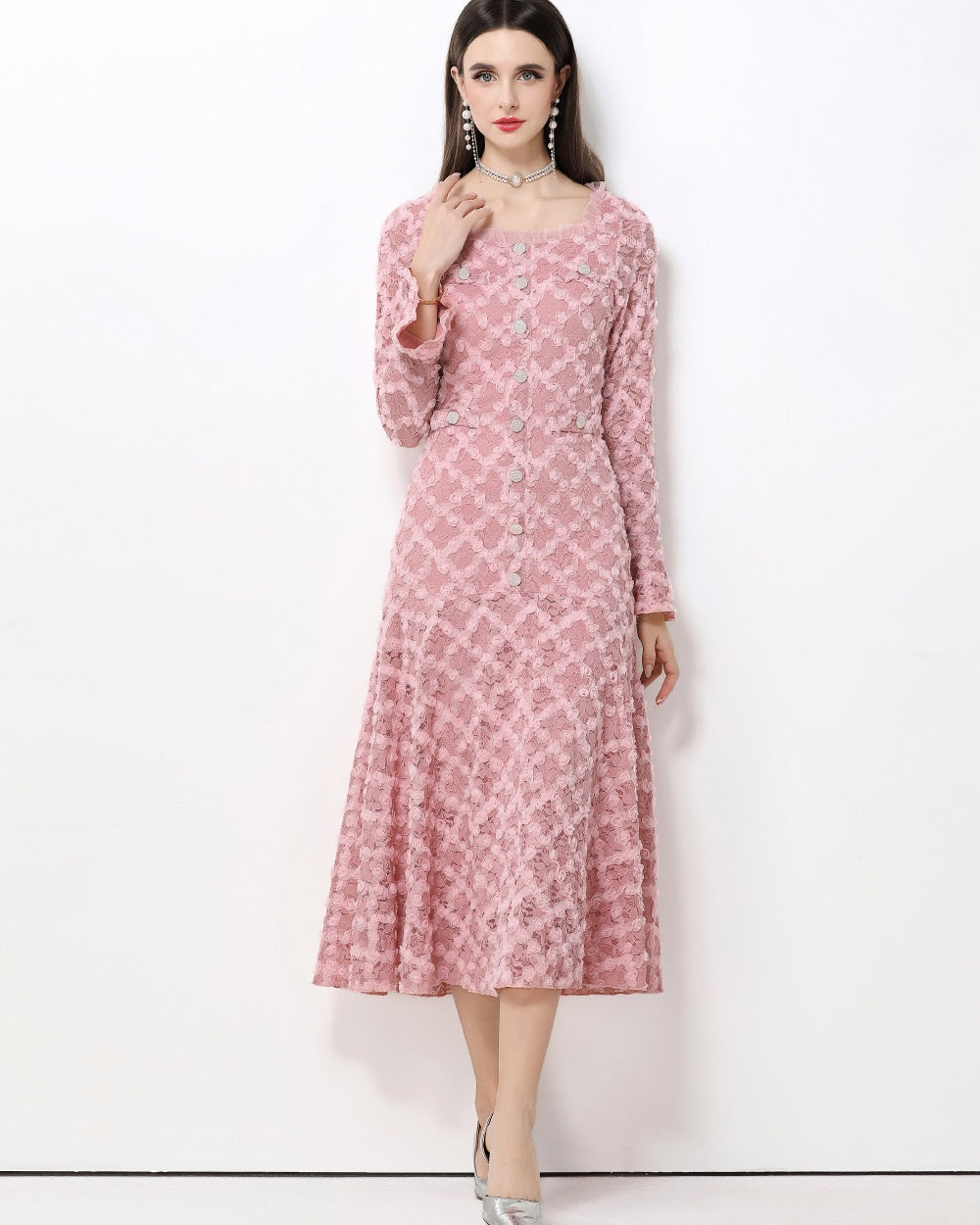CM-DY061769 Women Elegant European Style Lace Floral Square Neck Long Sleeve High Waist A-Line Dress - Pink
