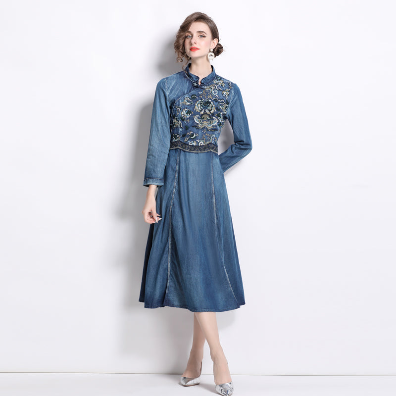 CM-DY066564 Women Elegant European Style Embroidery Stand Collar Long Sleeve Midi Denim Dress