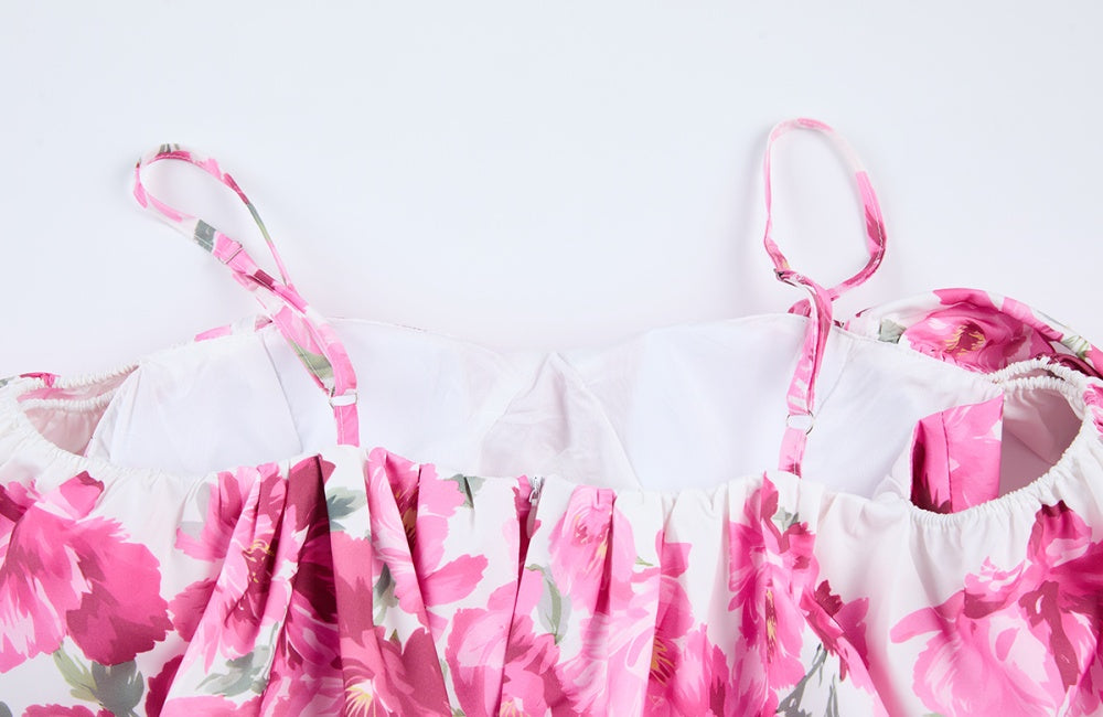 CM-DY068245 Women Elegant European Style Floral Print Off The Shoulder Short Sleeve High Waist Long Dress - Pink