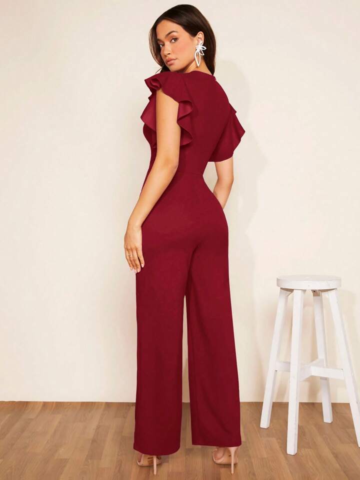 CM-JS151161 Women Elegant Seoul Style Plunging Neck Butterfly Sleeve Jumpsuit - Burgundy