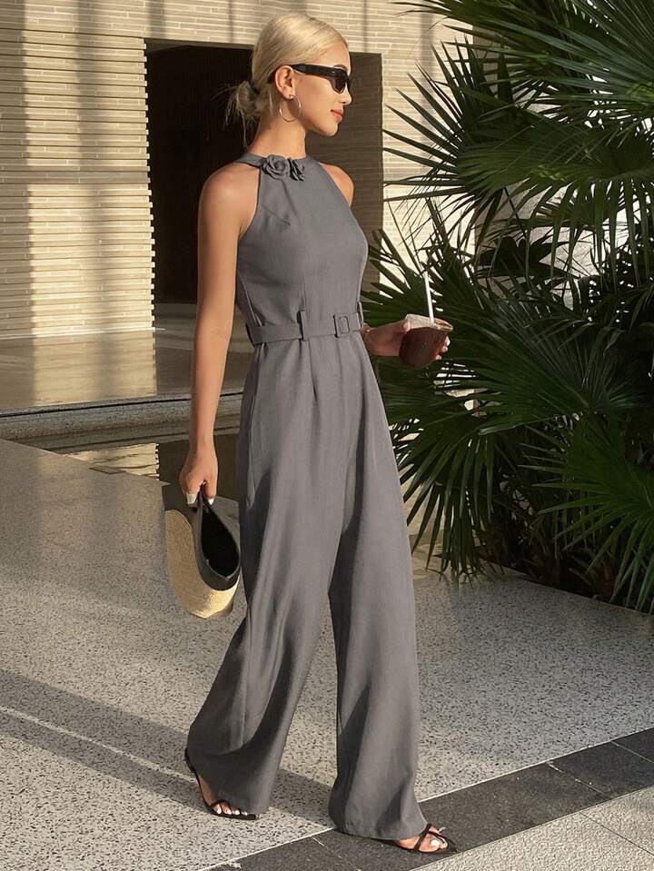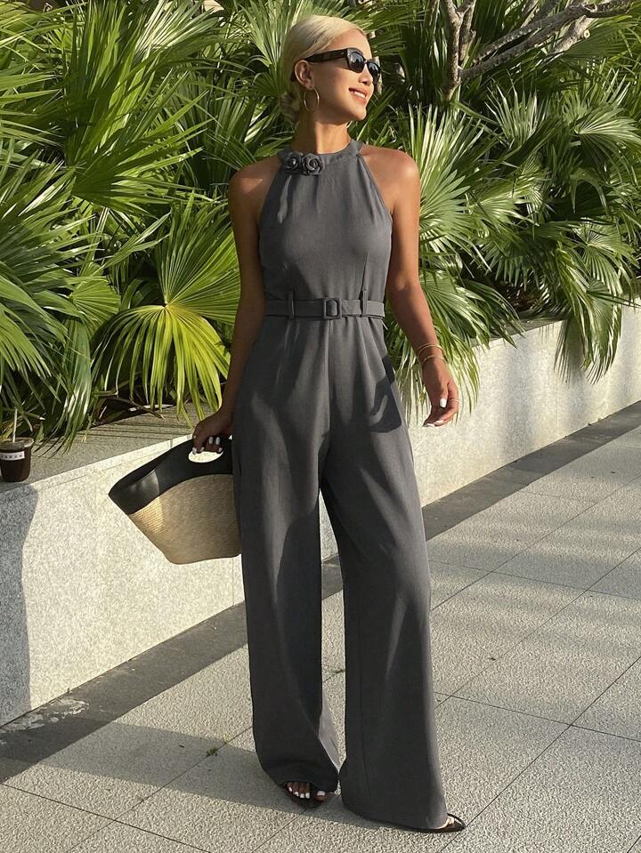 CM-JS324365 Women Elegant Seoul Style Halter Neck Cinched Waist Wide Leg Jumpsuit - Gray