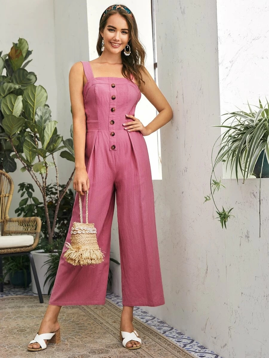 CM-JS401742 Women Elegant Seoul Style Sleeveless Button Front Open Back Cropped Jumpsuit - Pink