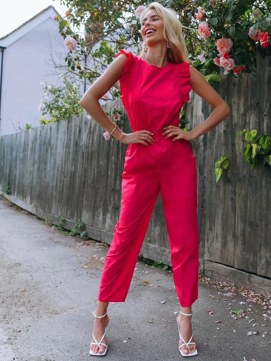CM-JS420342 Women Trendy Bohemian Style Tie Backless Ruffle Armhole Belted Jumpsuit - Red