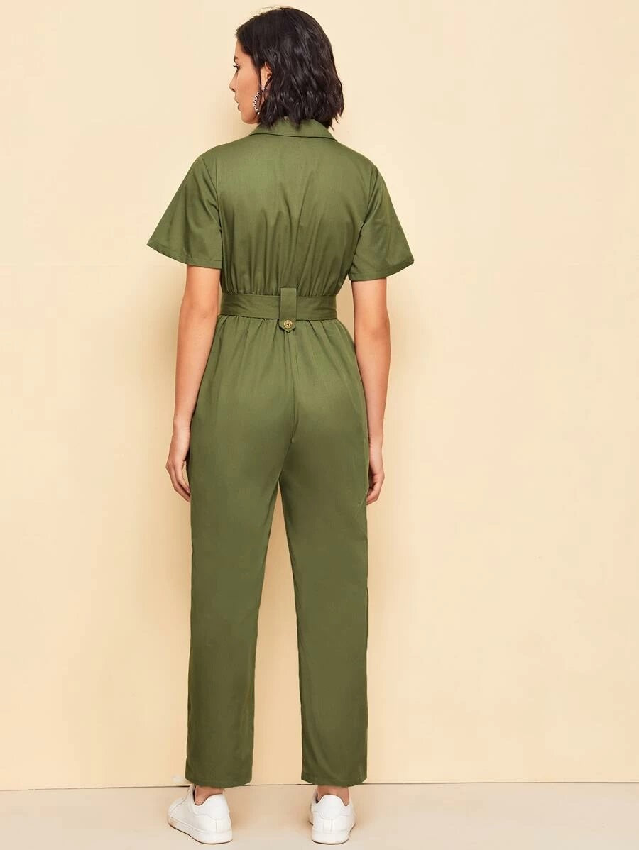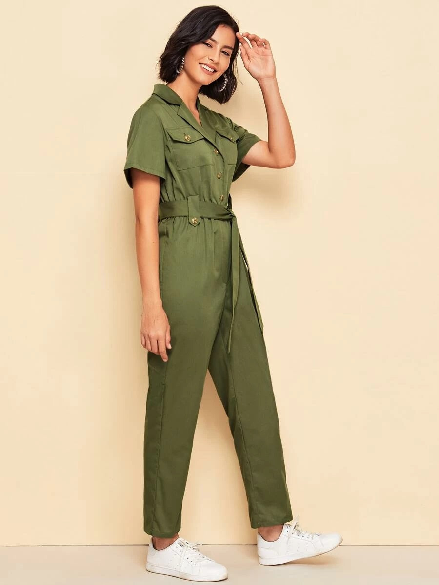 CM-JS429238 Women Elegant Seoul Style Notch Collar Flap Pocket Patched Self Belted Shirt Jumpsuit