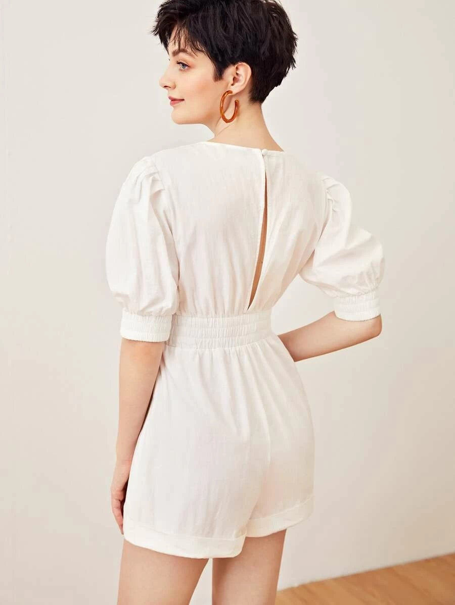CM-JS430101 Women Casual Seoul Style V-Neck Puff Sleeve Split Back Shirred Waist Romper - White
