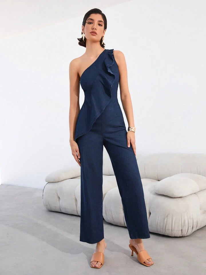 CM-JS438300 Women Elegant Seoul Style Ruffle Trim One Shoulder Sleeveless Jumpsuit