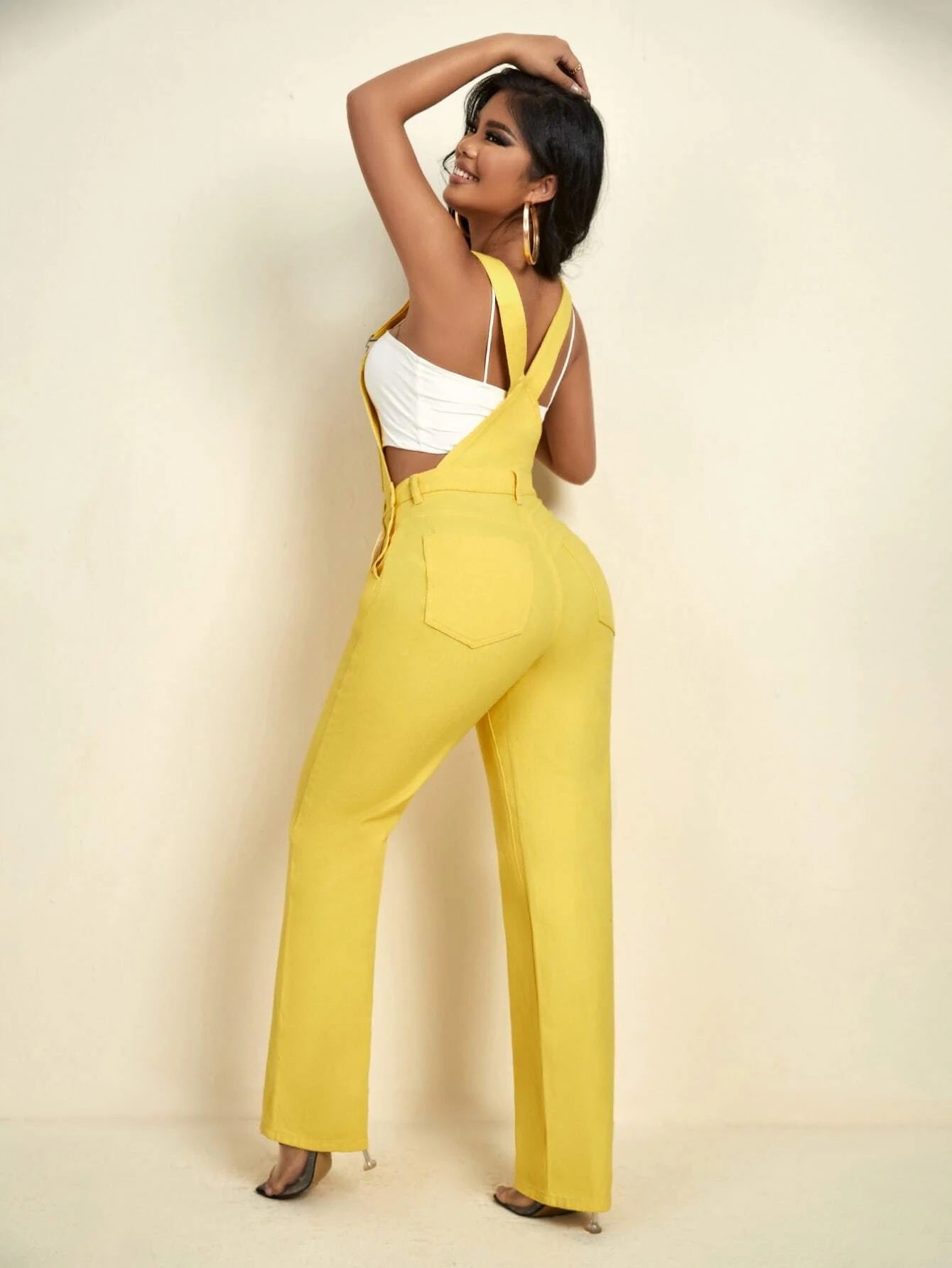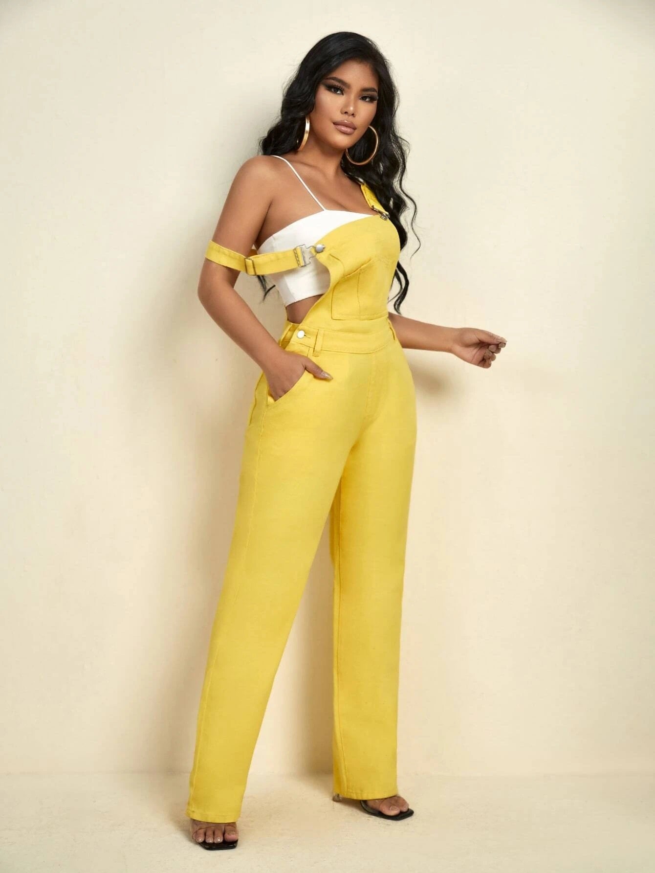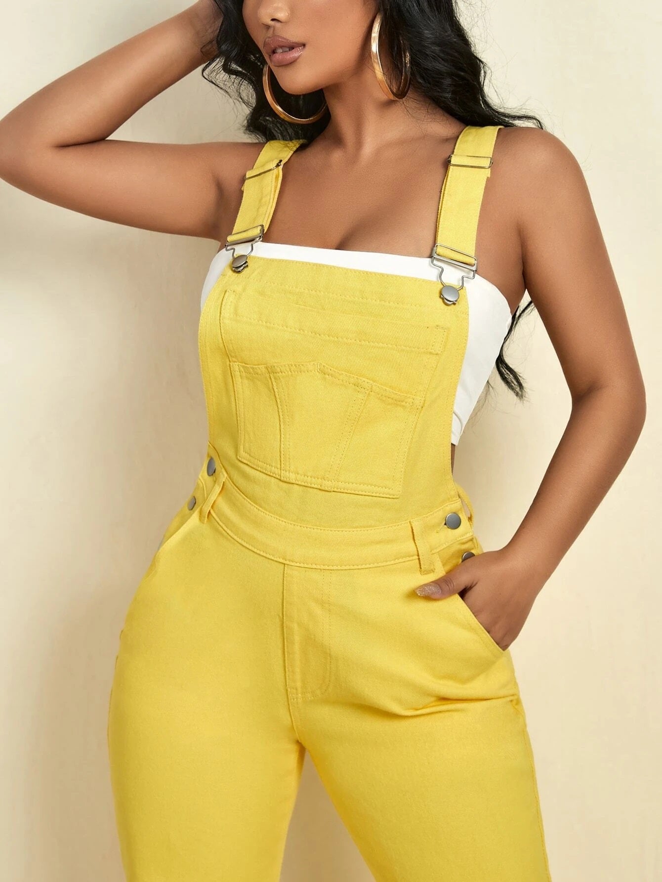 CM-JS552070 Women Preppy Seoul Style Patched Pocket Denim Straight Leg Overalls - Yellow