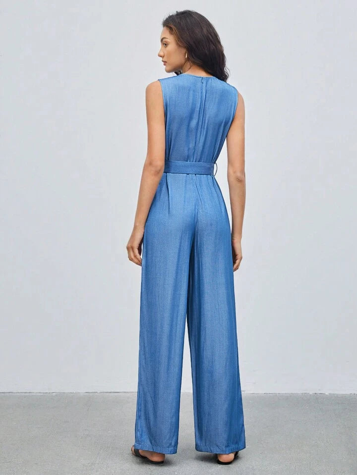 CM-JS759311 Women Casual Seoul Style Medium Wash Round Neck Belted Sleeveless Jumpsuit