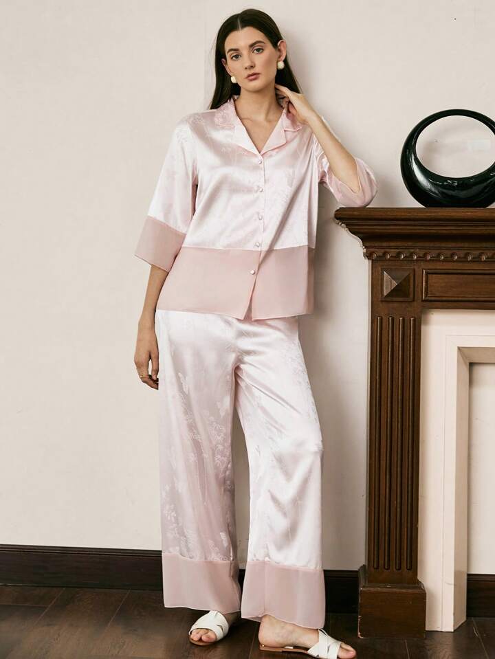 CM-LS048655 Women Trendy Seoul Style Bamboo Floral Reversible Collar 3/4 Sleeve Pajama Set - Baby Pink