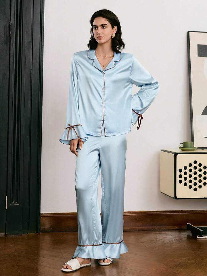 CM-LS071247 Women Trendy Seoul Style Ruffle Splicing Contrast Bow Satin Loungewear Set - Blue
