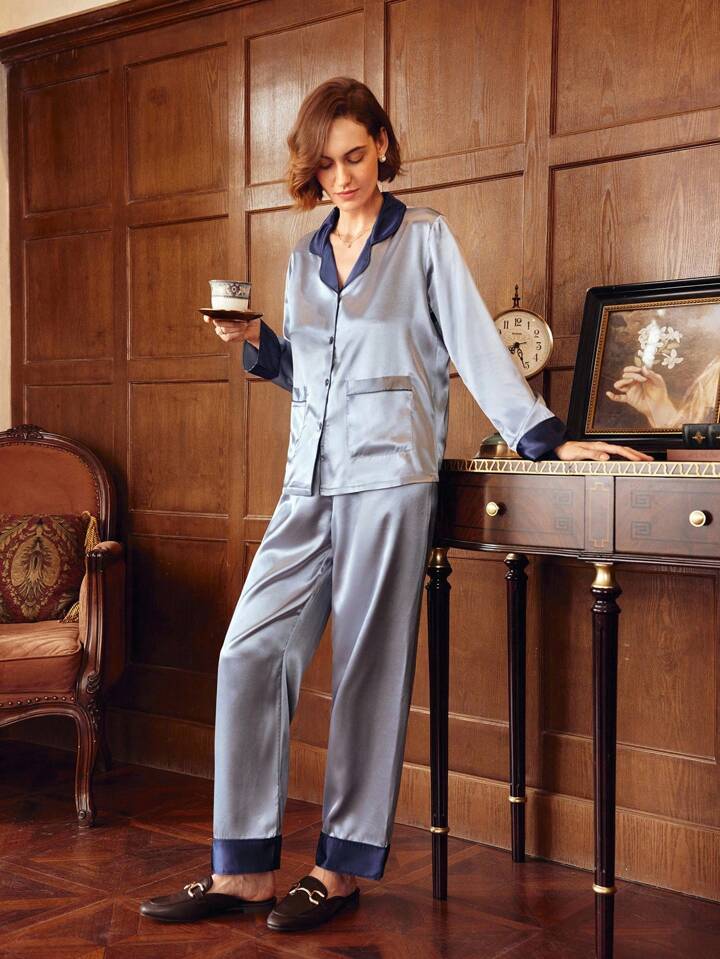 CM-LS073333 Women Trendy Seoul Style Satin Lapel Neckline Long Sleeve Pajama Set - Dusty Blue