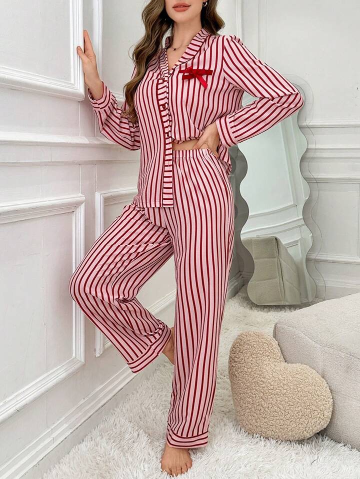 CM-LS158065 Women Trendy Seoul Style Bow-Tie Striped Long Sleeve Top With Pants Sleepwear Set - Red